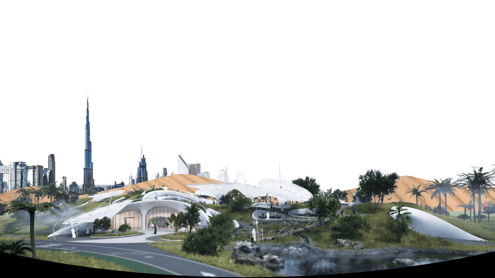 The Audiotheater is hidden like a jewel beneath the earth. Above it blooms a sanctuary of life. A futuristic park with organic architecture, flowing forms, and lush vegetation.